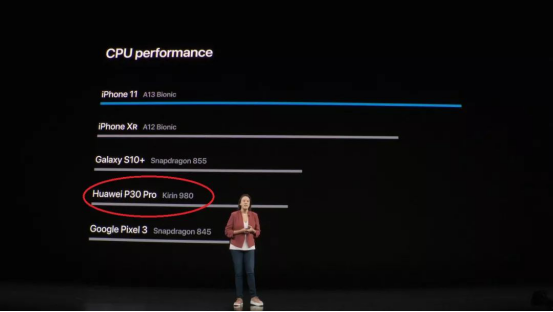 但就在备受争议的新品发布会上,另一个现象被媒体广为传播,那就是“傲娇”的苹果首次在主题演讲中开始提到竞争对手,其中就包括目前市场“最热”的华为。在现场演讲PPT进行到竞品分析阶段中,P30 Pro手机和麒麟980芯片赫然在列。