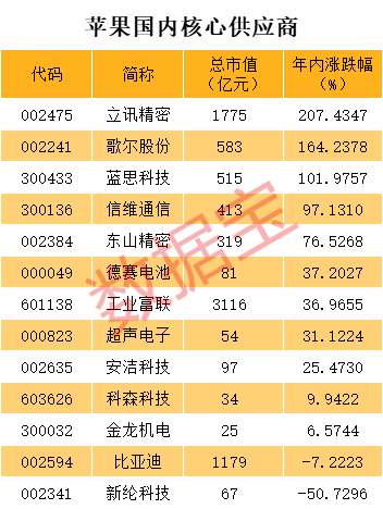 与此同时,苹果概念股也大幅走高。数据显示,今年内涨幅最大的苹果概念股是立讯精密,年内涨幅超过200%。同时,立讯精密也是兼苹果和华为的双概念股。