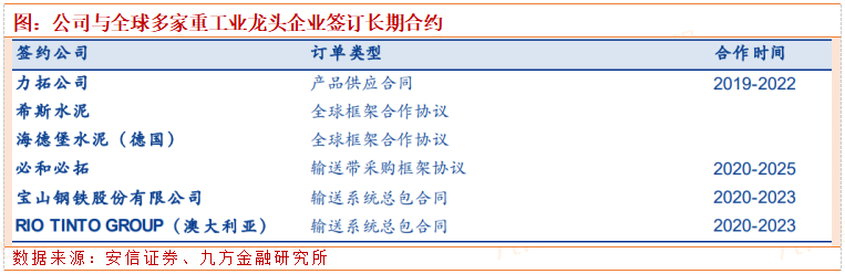 此外,2019年,公司与全球矿业巨头力拓公司签订了3+1+1年的供应合同;与全球水泥行业巨头希斯和海德堡两家公司签订了全球合作框架协议。2020年,公司与必和必拓签署了5年的输送带采购框架协议,涵盖了必和必拓澳洲铁矿、煤矿、铜矿和镍矿等。