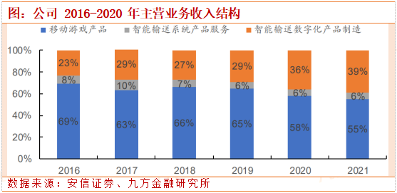 移动游戏仍为营收主力,智能输送产品高速增长。自2016年并表易幻网络后,移动游戏产品贡献主要营收,但智能输送数字化产品制造保持高速增长。2021年,公司移动游戏产品、智能输送数字化产品制造、智能输送系统产品服务三项主要产品营收分别为15.28亿元、10.62亿元、1.70亿元,分别占公司营业收入总额的55.36%、38.49%、6.14%。其中智能输送数字化产品制造业务收入同比增加13.10%,占营业收入比重从2020年的35.58%增加到2021年的38.49%。
