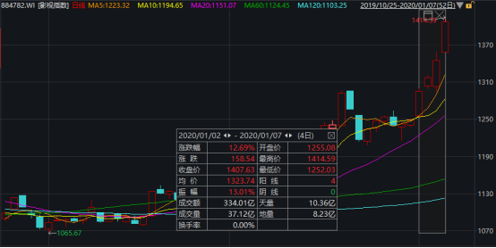 连续三年涨幅垫底的影视板块突然爆发,截止1月7日,影视指数已经上涨了12.69%。仅7日当天,影视指数盘中一度上涨超5%, 最终收在了1407.63,上涨4.66%。