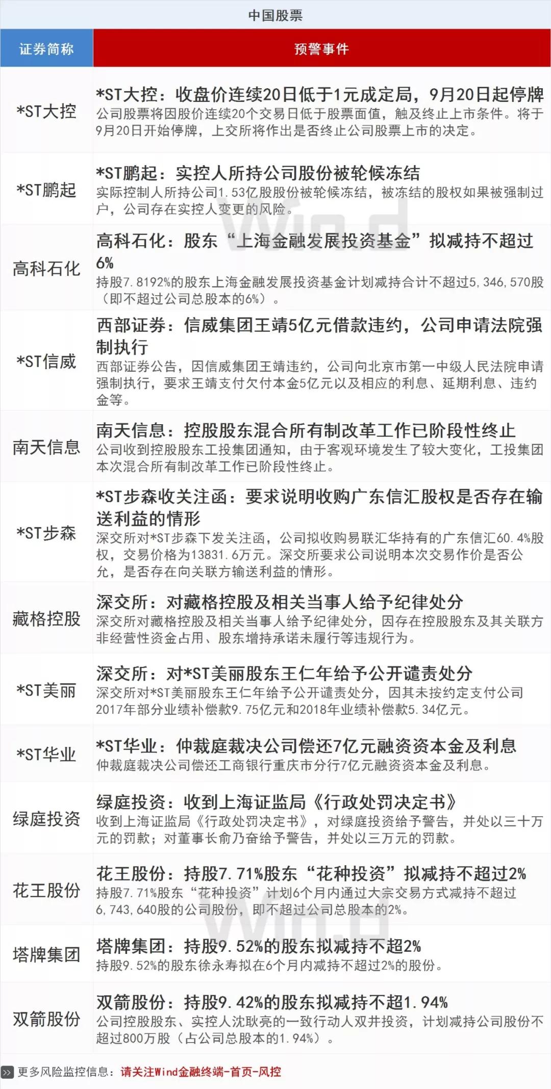 A股每日投资预警:高科石化股东减持将达到6%!
