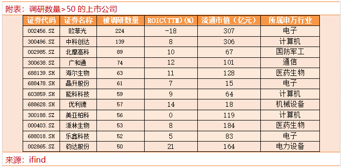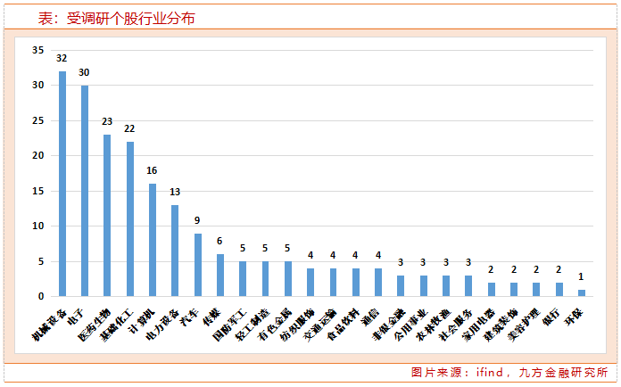 从行业分布来看,本周还是机械设备、电子行业调研量居于前列,分别有32、30家上市公司接受调研;随后为医药生物、基础化工行业,均有超20家上市公司接受调研。