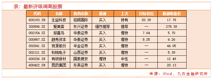 近5日有8家公司获得券商调高评级,其中明确给出目标价格的有生益科技、报喜鸟、越秀资本。
