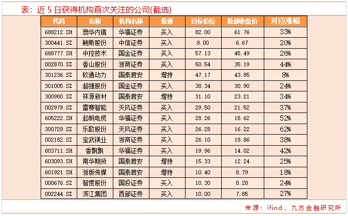 最新机构首次关注股票方面,近5日共有52份研报对上市公司进行首次覆盖,其中,16家获得明确的目标价格。