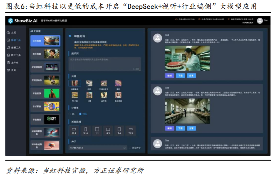 模型开源有利于生态搭建,激发产业链厂商对AI技术应用落地的探索热情,也为开源模型厂商及团体赢得更高的产业关注度及话语权。2025年以来,Deepseek、阿里巴巴等厂商模型相继选择开源,有利于当虹科技等厂商部署及进一步开发,公司产品能力的提升预计加速。当虹科技自主研发的多模态视听大模型BlackEye,已经深度融合DeepSeek-R1和DeepSeekJanus-Pro,能够对文本、图像、音频、视频乃至三维模型等多种模态信息进行深度理解,并实现多模态内容的推理与生成。