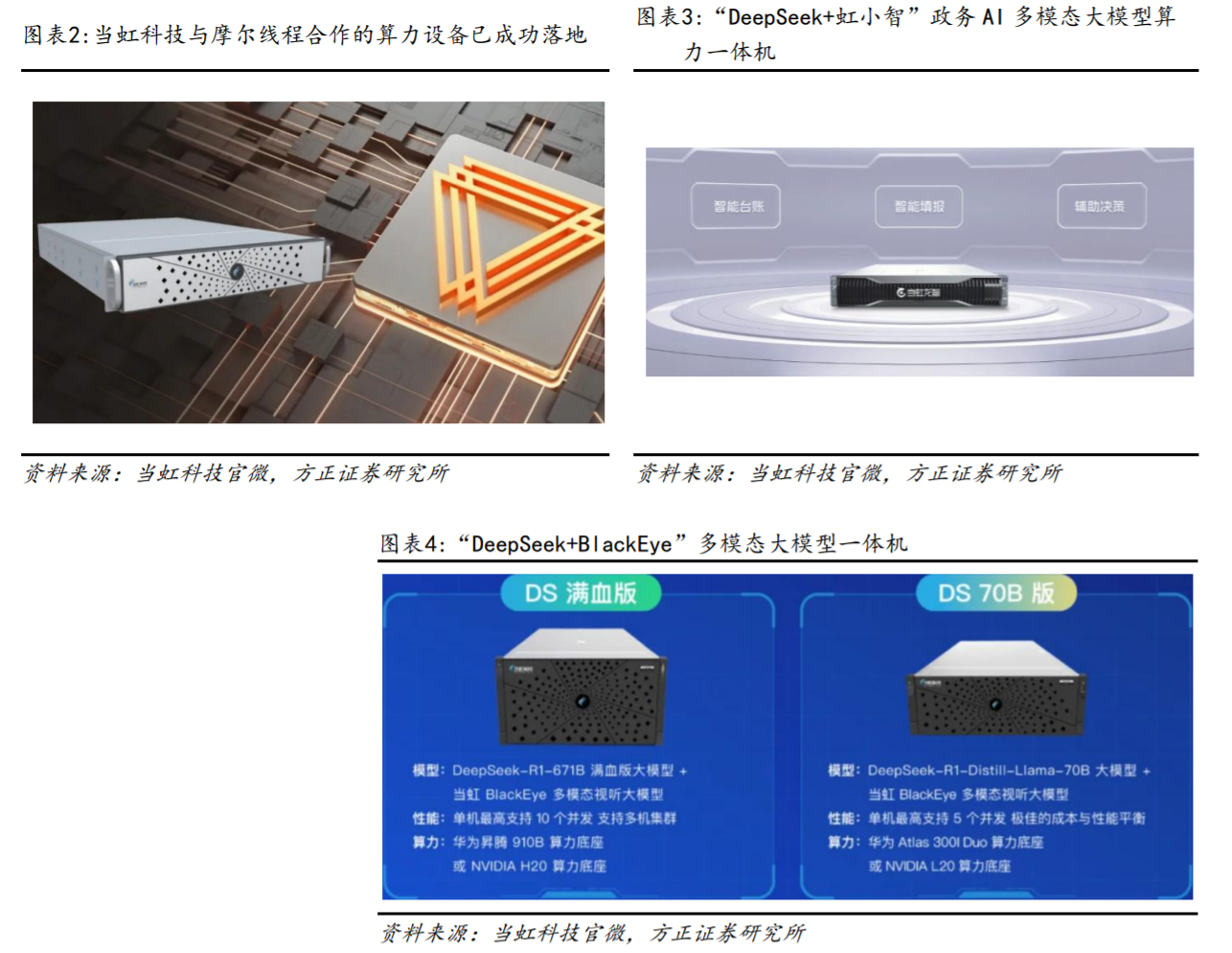 与摩尔线程达成深度合作,多款DeepSeek一体机发布。2025年3月,当虹科技基于国产全功能GPU成功完成了BlackEye多模态视听大模型深度融合,且双方合作的算力设备已经在超高清GPU算力场景中成功落地,在视听内容生产、图形渲染、视频编解码等方面合作前景广泛。2025年2月,当虹龙智正式发布“DeepSeek+虹小智”政务AI多模态大模型算力一体机。“DeepSeek+虹小智”大模型算力一体机适配了华为鲲鹏和昇腾全国产化算力平台,具备“多模态思维”,可以广泛应用于一网通办、智能台账、智能填报、智能巡检、辅助决策等多种场景。基于“DeepSeek+虹小智”政务AI大模型的双模引擎创新,公司开发了社区基层减负平台和国有资产动态管理系统,实现社区行政负担明显降低与国有资产盘活率显著提升。2025年2月,当虹科技发布“DeepSeek+BlackEye”多模态大模型一体机,为传媒行业发展注入新活力,客户主要为电视台、互联网视频、运营商及新媒体机构。DeepSeek的“大脑级”推理+BlackEye的“感官级”感知及创作,构建从认知到生成的智能链路闭环。