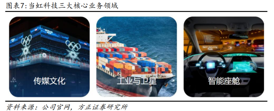 基于以上自研的核心技术及优势,当虹科技提供“传媒文化”、“工业与卫星”和“智能座舱”的完整音视频及娱乐解决方案。1)车载智能座舱:基于视频压缩、超低延迟编码、视频娱乐等核心能力,落地智能座舱解决方案,已覆盖多家车企。2)工业与卫星:视频超级压缩产品快速拓展,涵盖能源、电网电力、轨交等行业,还有基于卫星互联网的超窄带场景、远洋船舶等。3)传媒文化:涉及IPTV新媒体、广播电视、互联网视频,公司加深了与运营商的合作,将AI能力融合进赛事直播、转播等各个场景。