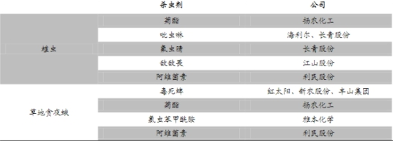 据海通证券梳理,蝗虫和草地贪夜蛾虫害受益的杀虫剂公司如下:
