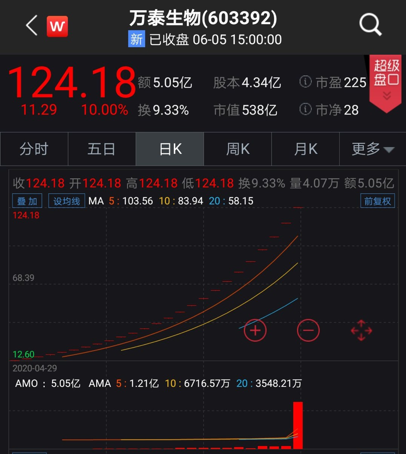 万泰生物于4月29日登陆沪市主板,发行价仅为8.75元/股,在收获25个连板之后,其最新股价为124.18/股,涨幅已超13倍。