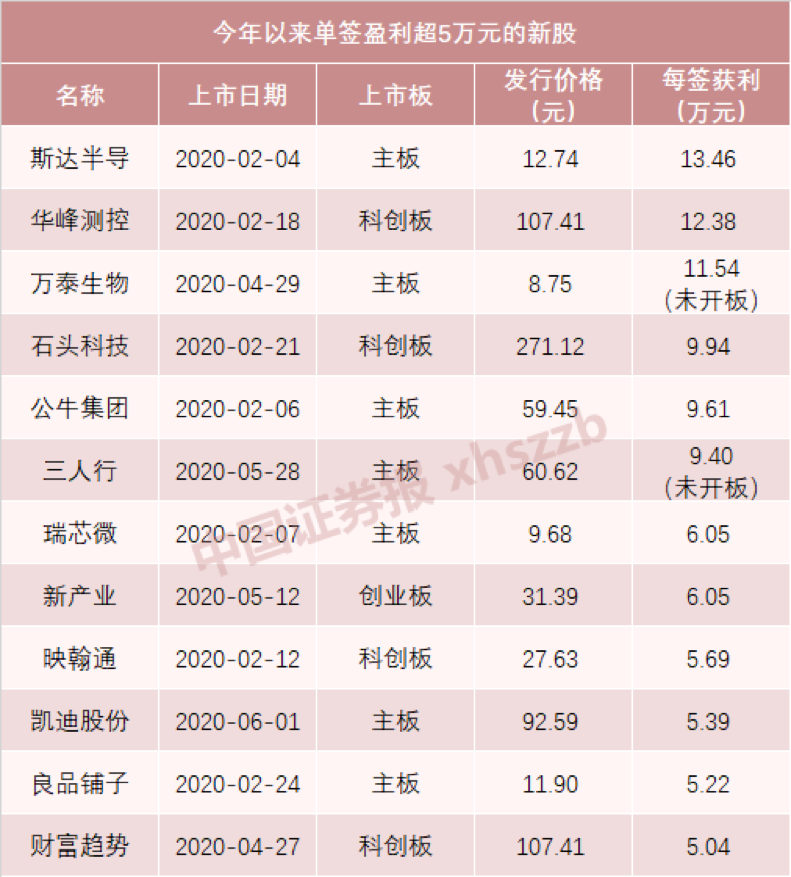 此前,万泰生物收获了25个一字涨停板,单签盈利为11.54万元,三人行收获了7个一字涨停板,单签盈利为9.4万元。这两只新股至今仍未开板。