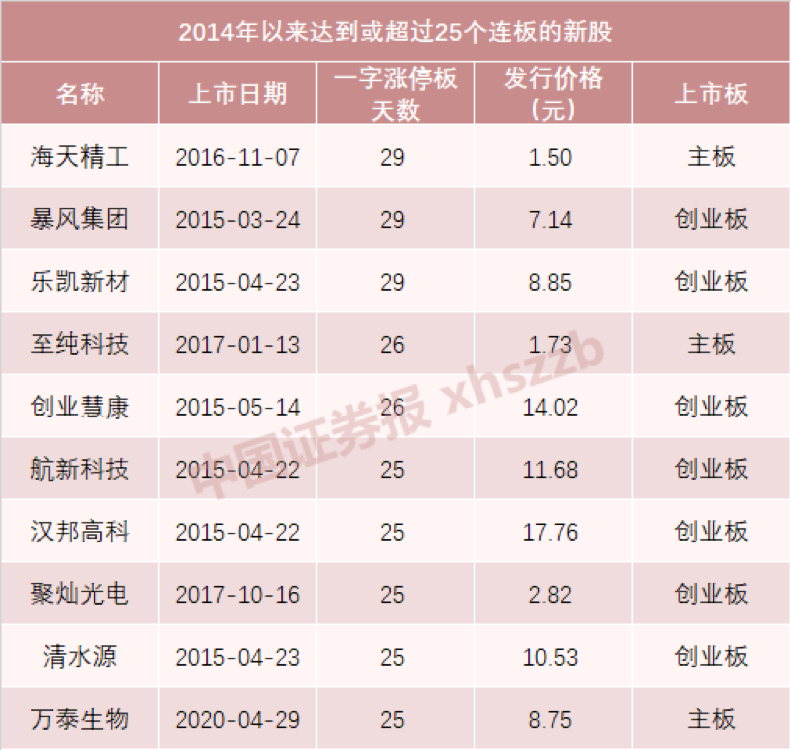 25个连板的万泰生物,是今年以来一字连板最多的新股,同时也跻身新股一字连板数 Top10 行列。自2014年A股实行新股上市首日44%涨跌幅限制以来,只有10只新股的连板数达到了25个及以上。