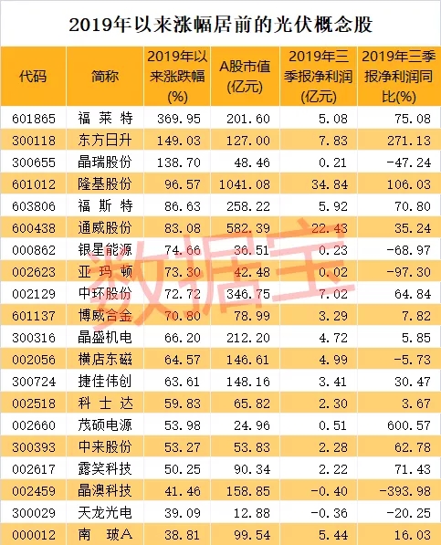 在过往近一年时间里,光伏概念股整体表现差强人意。证券时报·数据宝统计显示,2019年以来,光伏概念股平均涨幅为37.2%(剔除2019年上市新股首日涨幅),跑赢同期沪指。3只个股累计涨幅翻倍,分别是福莱特、东方日升、晶瑞股份。福莱特于去年2月份登陆上海主板,公司主营光伏玻璃、浮法玻璃、工程玻璃和家居玻璃的研发、生产和销售。去年前三季度实现盈利5.08亿元,同比增长75%。