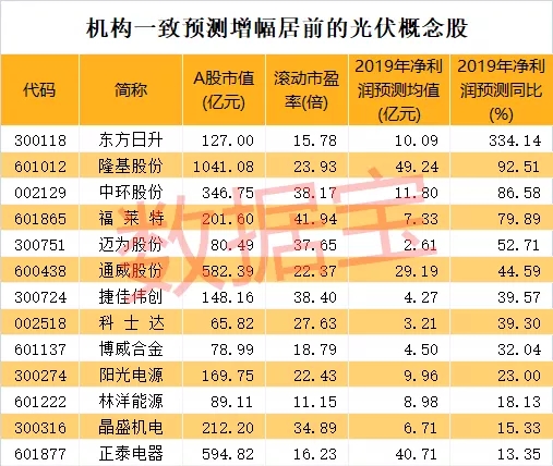 按照5家以上机构一致预测结果,数据宝统计显示,13只光伏概念股2019年净利润一致预测增幅超过10%。净利润一致预测增幅最高的是东方日升,机构一致预测该公司净利润为10.09亿元,同比增长334%。行业龙头隆基股份一致预测净利润为49.24亿元,同比增长92.51%。另一只行业龙头通威股份一致预测净利润为29.19亿元,同比增长44.59%。