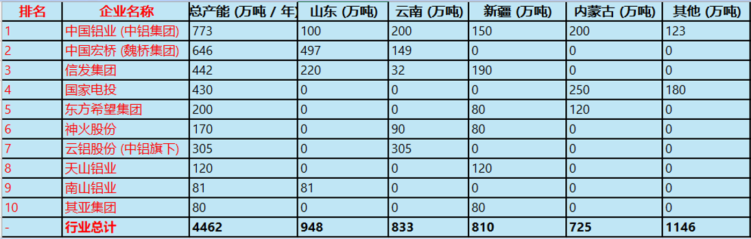 国内电解铝企业产能分布 |