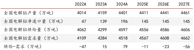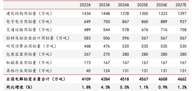 我们预计2025-2027年全国电解铝需求量分别4567/4608/4662万吨,分别同比增加49/42/53万吨;其中,2025-2027年建筑结构用铝量分别为1350/1323/1297万吨、电子电力用铝量分别为860/889/927万吨、交通运输用铝量分别为676/716/758万吨;2025年铝材及铝合金出口/耐用消费品/包装容器/机械装备/其他行业用铝量分别为567/535/280/167/131万吨。