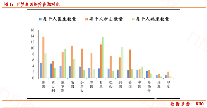 医疗资源普及度仍较低。根据世界卫生组织Global Health Observatory的数据,目前我国每千人医生数、护士数、病床数分别为2.6人、2.9人、3.8张,整体上与欧美发达国家尚存在一定差距,尤其是护士数量严重不足,而护士数量与医疗质量密不可分。2018年柳叶刀杂志发表的一项研究中,中国医疗质量及可及性指数评估为78分,而发达国家普遍在90分以上,差距较大。