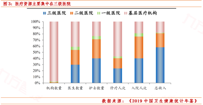 公立医院集中在大城市。中国卫生健康统计年鉴数据显示,2018年全国共有医疗机构97万家,其中城市公立医院2万余家,而等级最高的三级医院2500余家。由于三级医院主要位于地级市以上行政级别的城市中,县域及乡镇较少,三级医院医疗资源的过度集中和虹吸效应制约了分级诊疗及全民医疗均等化的推进。