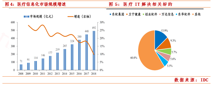 医疗信息化是医疗产业的基础设施。医疗信息化包括医院信息化、区域医疗信息化和医疗大数据系统三个层次,现阶段以医院信息化为主体。医院信息化以电子病历为核心,通过辅助记录、处理、存储医疗信息提升诊疗质量和效率。根据IDC数据,2018年我国医疗信息化市场规模492亿,过去三年年化增长15%,增速较快。政策要求2020年二级以上医院电子病历评级需提升至3级以上,而2018年国内三级医院和二级医院电子病历平均评级分别为0.83级、2.11级,因此预计我国医疗信息化产业将在政策推动下维持较快增长。目前我国医疗信息化行业相对分散,以医疗IT解决方案为例,5家头部企业市场份额市占率合计40%,其中龙头东软集团14%。