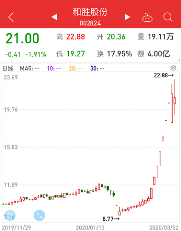 和胜股份2月走出了股价17连阳的牛气走势,2月19日后更是实现七连板,今年以来股价累计涨幅达93%。2月26日公司发布减持公告,公司两大股东拟合计减持不超过550.8万股,减持股份占总股本比例不超过3%。该股近七个交易日中共4次登上龙虎榜。昨天盘后的龙虎榜显示,卖方前三席位均为前一交易日上榜龙虎榜的买方席位,游资上演一日游行情。