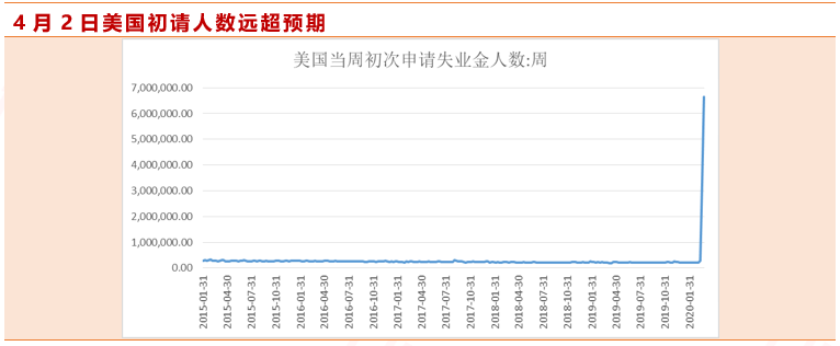 受到疫情冲击,2020年4月2日公布的最新美国3月第三周初次申请失业金人数达到664.8万人,远远高于预期650万人以及前值330万。而初次申请失业金人数的暴增也预示了美国失业潮已经爆发,疫情对美国经济基本面的冲击开始体现。