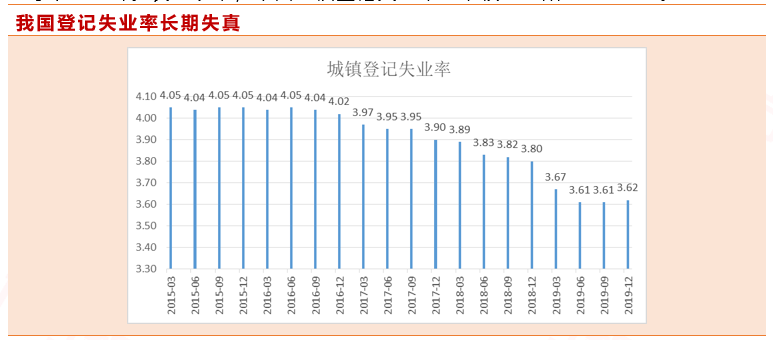 2018年之前,我国政府公布的就业指标主要以城镇登记失业率为主。目前的城镇登记失业率指的是城镇登记失业总人数与同地区从业人数和失业人数总和的比例关系。由于登记失业率对失业者主观登记的依赖较大,而目前我国企业用工方式很多并不需要登记从业,同时很多待业青年并不愿意去登记失业领取补助,再加上并没有包含农村就业人口,所以登记失业率很难全面客观反应真实失业情况,一直以来改革呼吁不绝于耳。长期以来,中国城镇登记失业率变动很小且始终低于5%。