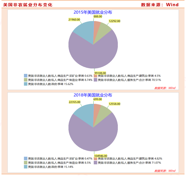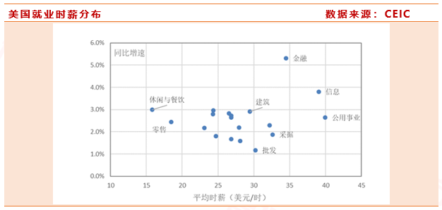 在全球化大背景下,美国非农就业的行业结构分化进一步加剧,突出表现在美国的优势产业(金融、科技、能源)呈现“高时薪、高工时、高增速”的三高特点,而非优势产业(零售、餐饮、休闲)呈现“低时薪、低工时、低增速”的三低特点,二者持续背离。