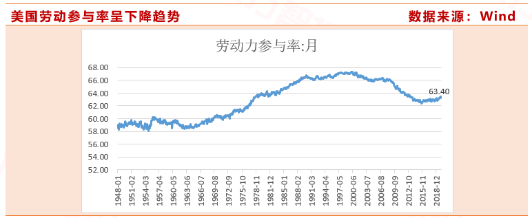 劳动参与率反映了潜在劳动者个人对于工作收入与闲暇的选择偏好,其受到个人生活追求、社会保障、就业结构、经济前景的多重影响。近期以来美国劳动参与率维持在63%左右,且随着美国适龄劳动人口占比的下降,分子效应带动劳动参与率的回落。