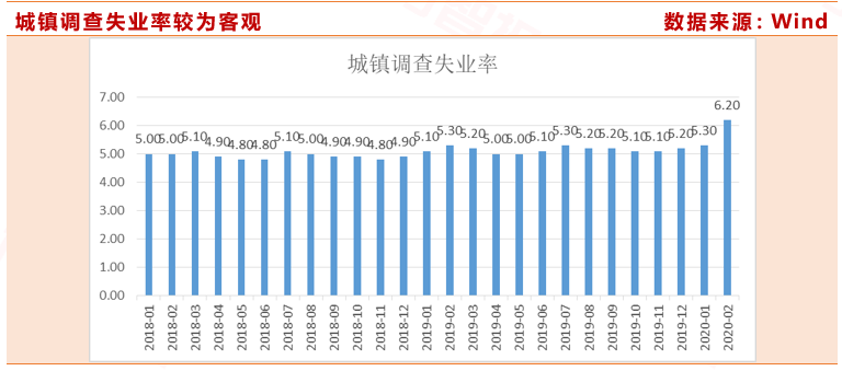 由上图可见,城镇调查失业率自发布以来一直高于登记失业率,且波动较大,2020年2月由于疫情原因从前值的5.3%飙升至6.2%的历史高点,预计未来一段时间失业率仍将维持在6%上方。