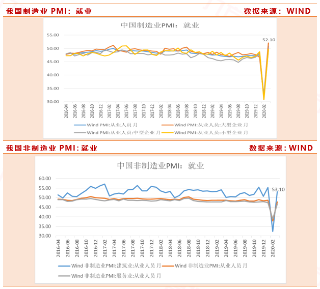 非制造业方面,从业人员指数开始回升至53.1,但服务业和建筑业就业指数依旧处于萎缩区间,就业主要由金融和批发零售带动。预计随着复工复产的进一步推进,建筑和服务业将开始企稳。