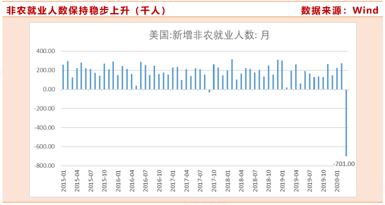 非农就业人数增加代表社会需求上升,而回落则代表经济有下行趋势,能够较好地反映美国就业市场的真实状况。随着美国疫情的超级爆发,企业裁员严重,非农数据肯定严重萎缩,但由于4月非农调查时间截至3月12日,早于疫情爆发时期,故5月数据才能真实反映疫情对就业的强大冲击。
