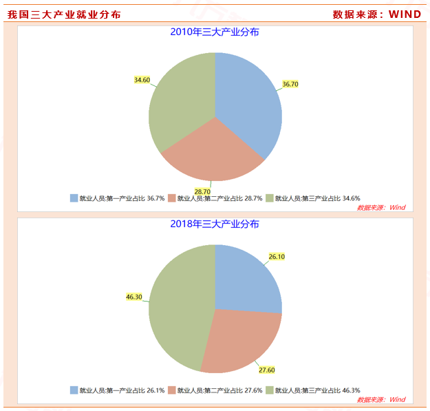 我国的就业人口中,第三产业分布近年来持续上升,第一产业占比直线下降。2010年三大产业就业人数占比分别为36.7%、28.7%、34.6%,2018年第三产业占比升至46.3%,第一产业和第二产业分别为26.7%和27.6%。