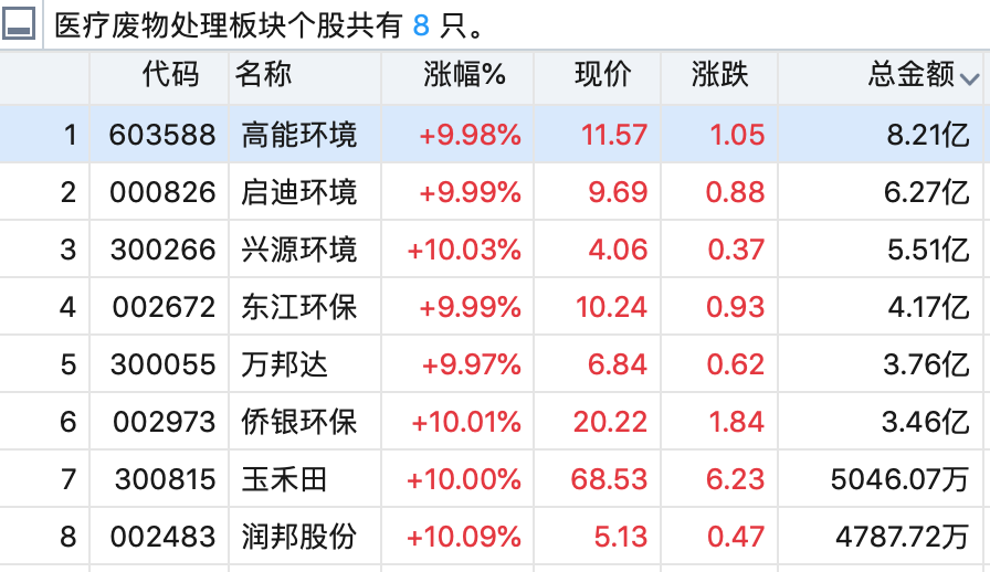 今日,医疗废物处理板块全线涨停,个股方面有,润邦股份、兴源环境、侨银环保、玉禾田、东江环保、启迪环境和高能环境,合计成交总额超过33亿。
