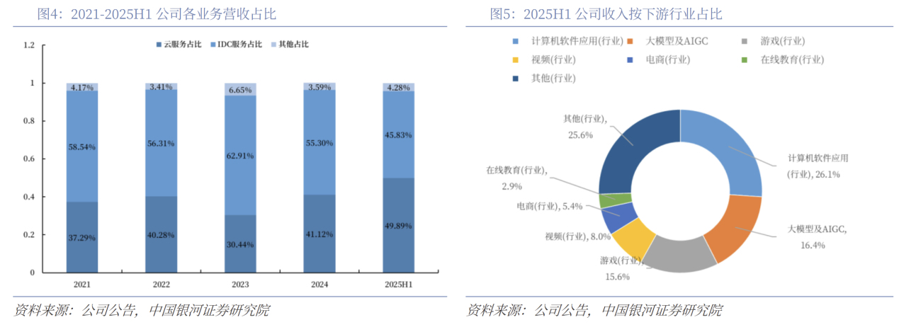 从营收结构来看,近三年云服务收入占比不断提升,IDC收入占比持续下降,预计未来趋势仍将延续。2025H1公司计算云、智算云、IDC服务收入占总营收的比例分别为31.58%、18.31%、45.83%。按下游行业占比来看,大模型及AIGC行业收入占比达16.40%,是公司重要的新兴增长领域,2025H1收入1.03亿元,同比大幅增长70.66%。