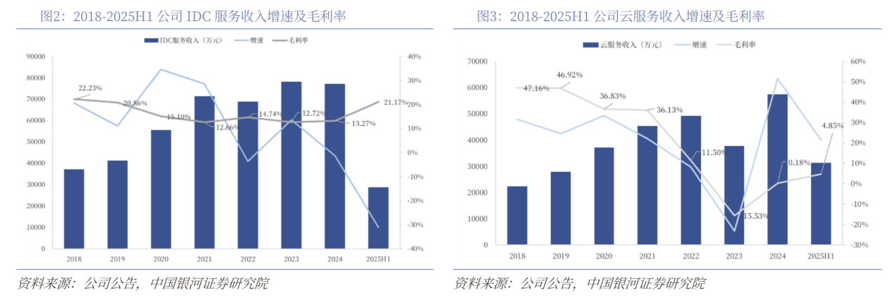 IDC服务:这是公司传统的优势业务,也是目前毛利率最高的业务板块。2025年上半年实现收入2.88亿元,毛利率为21.17%。为提升整体经营质量,公司正主动缩减部分低毛利的传统IDC业务,导致该板块收入同比下降-30.93%,但毛利率同比提升了7.49个百分点。