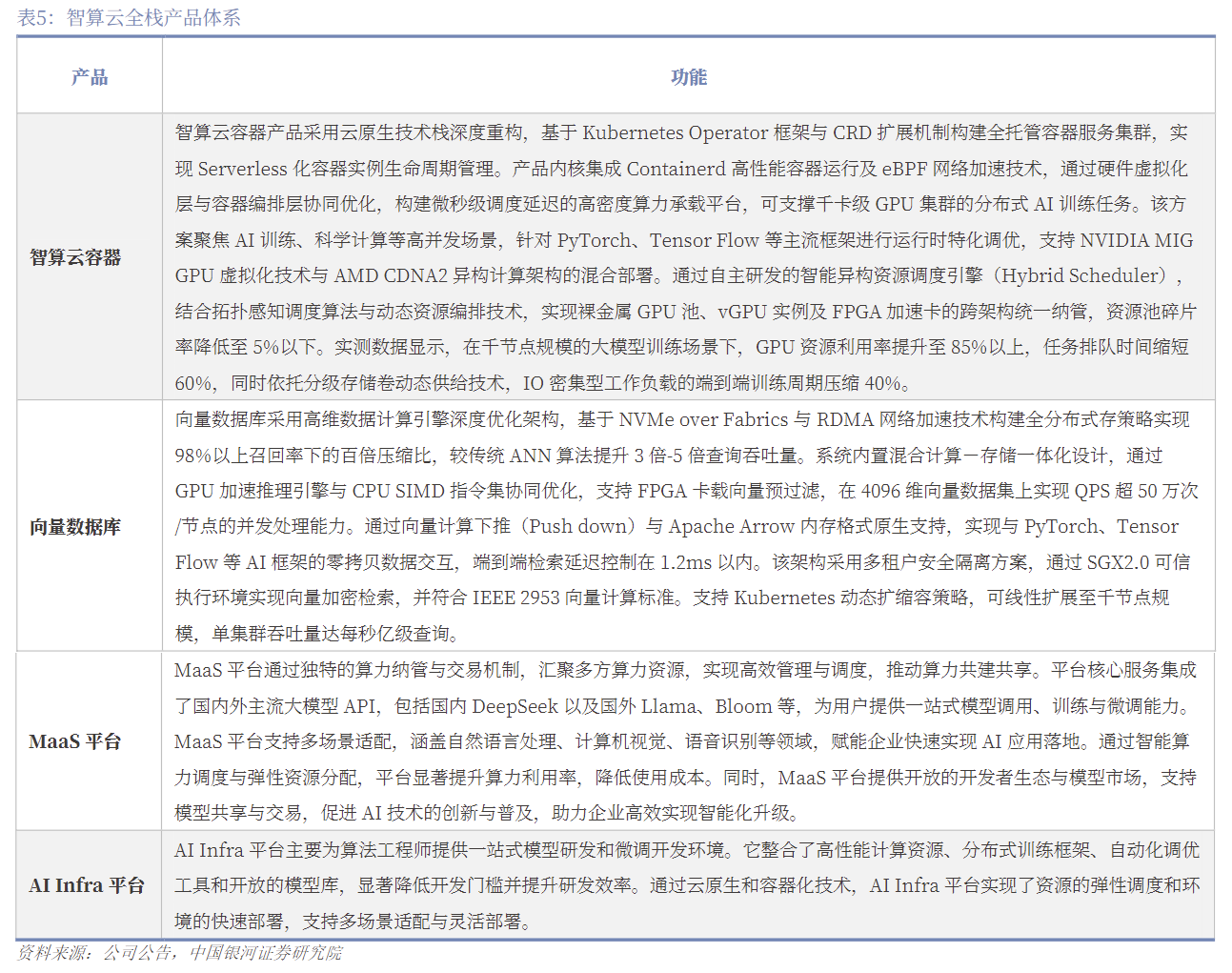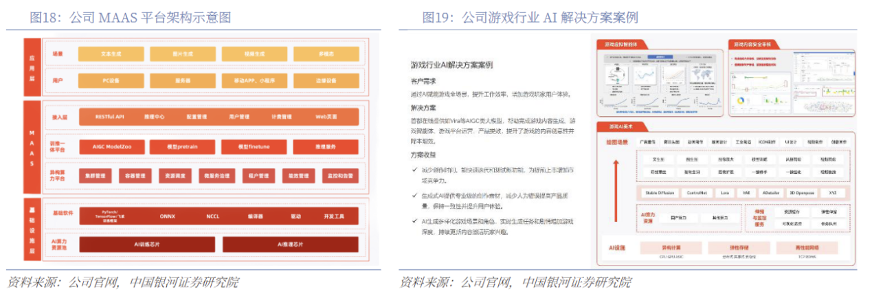 (二)公司创新推出MaaS与AIInfra平台,完善智算云全栈产品体系公司已快速构建起智算云全栈产品体系,涵盖智算容器云、向量数据库、MaaS平台、AIInfra平台及大模型一体机等。公司服务模式从简单的算力租赁,向模型加载服务、计费容器服务以及应用端服务等高附加值的方向演进,有助于提升整体毛利。