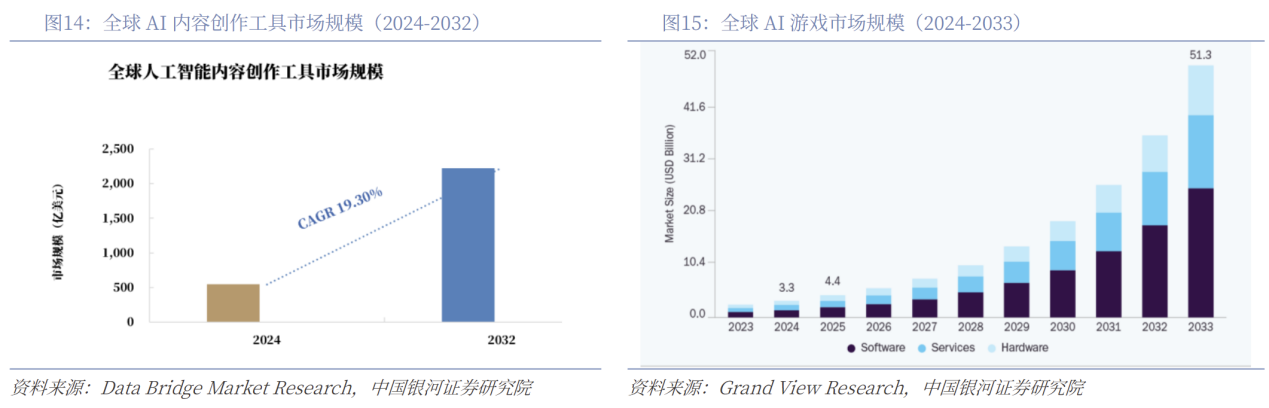 公司下游行业主要包括大模型及AIGC应用、游戏、视频、电商、互联网等,预计未来5年对AI算力需求高增长,并且为出海重点行业。根据DataBridgeMarketResearch,2024年全球人工智能内容创作工具市场规模为542.8亿美元,预计到2032年将达到2,227.2亿美元,2024-2032年复合年增长率为19.30%。北美目前是全球最大的市场,2024年收入份额最高,为38.5%,这得益于其成熟的AI生态、企业快速数字化与自动化工具广泛采用的推动。亚太地区预计将成为未来几年增长最快的市场。同时,根据GrandViewResearch,2024年全球游戏人工智能市场规模约33亿美元,北美收入占比35%;预计到2033年全球市场规模将达到513亿美元,2025-2033年的复合年增长率为36.1%。