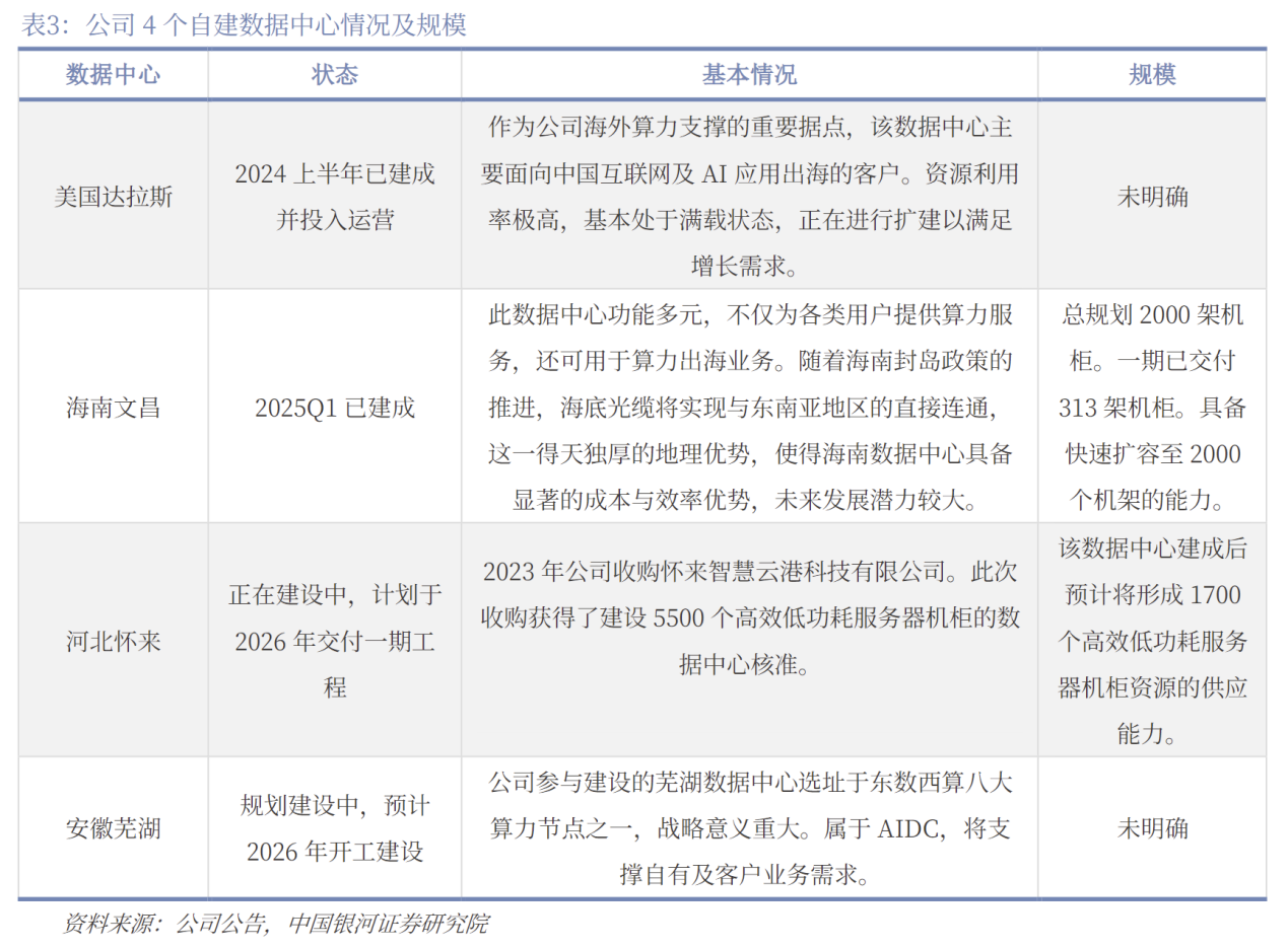 公司在国内外共规划建设了4个自有数据中心,自建的数据中心大多属于AIDC,在10kv以上,完全能够为AI应用客户提供支持。包括美国达拉斯数据中心和海南文昌数据中心,以及正在建设中的河北怀来数据中心与安徽芜湖数据中心。