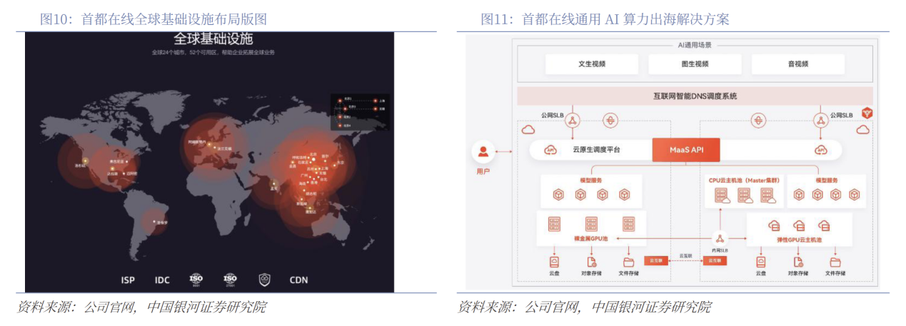 领先部署近100个全球化节点,协助中国AI企业出海。公司自2014年启动海外市场布局,自主研发的GIC平台可在全球范围内秒级开通、管理、调度云服务及网络资源,该平台业务范围遍及50多个国家和地区,在中国以及海外三大核心区域美洲、欧洲、亚太设有24个地域区域,52个可用区,近100个数据中心,只需5分钟即可完成全球业务的多点部署,实现一体化融合交付。北美市场凭借高度成熟的商业体系以及用户强烈的付费意愿,成为中国AI企业出海的核心战略要地。2024上半年,公司完成自建了首个海外智算节点,在美国达拉斯率先实现了智算业务的部署。