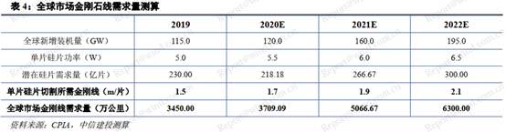 据CPIA预计,乐观情景下,2019-2025年间全球光伏新增装机量的复合增长率将达到11.7%。按照19年每片硅片(5W)需耗用电镀金刚石1.5米,之后随着硅片增大以及金刚线线径减小,假设每年每片硅片增加0.5W,耗线量上升0.2m,测算预计2020/2021/2022年金刚石线市场需求将达到3709/5067/6300万公里,同比增速分别为7.51%/36.6%/24.34%。