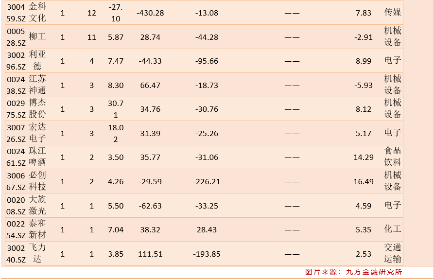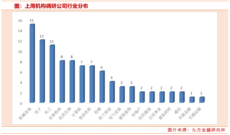 从行业分布来看,上周机构继续深耕泛科技行业。机械设备、电子和化工行业受调研家数位居前三,机构调研数量分别为15家、12家和11家,随后为农林牧渔和医药生物行业,各有8家公司获得调研。