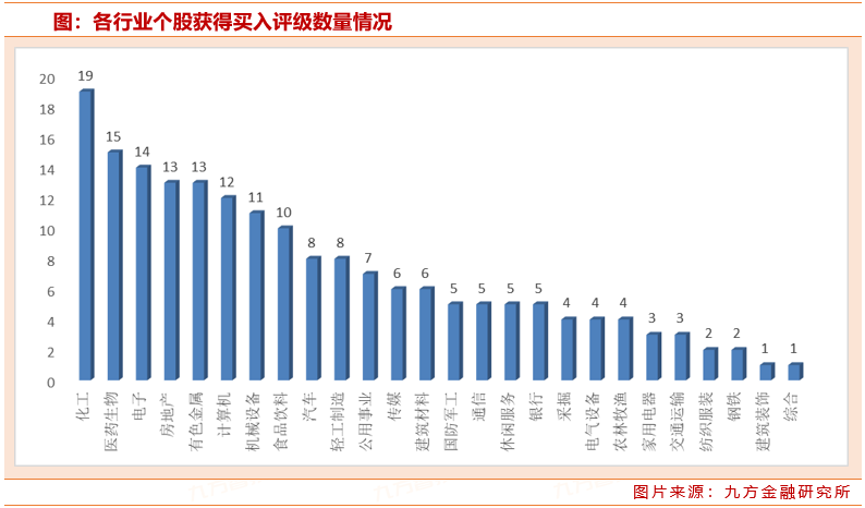梳理近5日机构发布研报并给出买入评级的公司,我们发现化工行业个股获得19次买入评级,数量居首;随后是医药、电子、房地产行业个股,获得买入数量分别为15、14、13次。