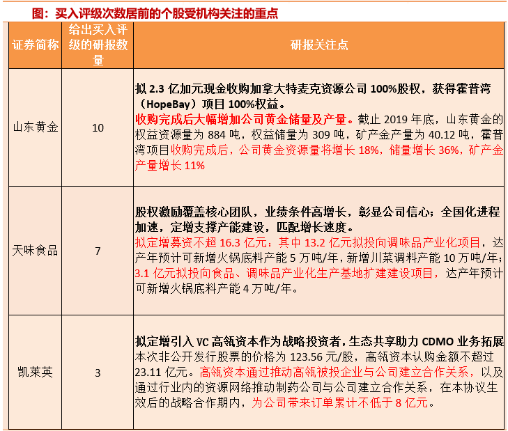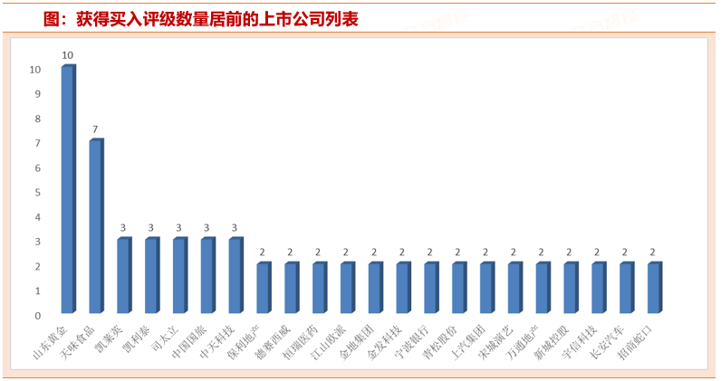 具体来看,共有146只个股获得买入评级,其中22只个股获得2份以上买入评级,次数最多的是山东黄金、天味食品,分别有10份和7份研报给出买入。