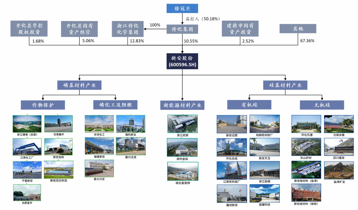 浙江新安化工集团股份有限公司(600596.SH)成立于1965年,2001年在上海证券交易所上市,实控人为建德市国有资产监督管理局,是国内化工行业龙头企业,深耕有机硅、作物保护两大核心领域,同时布局新能源材料、高端电子材料等新兴赛道,形成“硅基+磷基”双轮驱动、多板块协同的发展格局。公司是全球十大有机硅企业、全球农化20强,产品畅销全球130多个国家和地区,海外业务占比达38%,具备较强的全球市场竞争力。