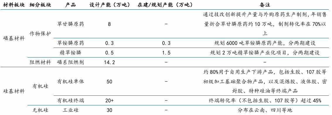 公司产能规划围绕磷基和硅基进行延伸,草甘膦和有机硅业务占比公司收入超80%。磷基材料板块包含作物保护和阻燃材料板块,作物保护板块中草甘膦原药产能为8万吨,制剂转化率在70%以上;草铵膦产能规划了6000吨产能分两期建设,现有产能为3000吨;精草铵膦规划了2万吨产业化项目分两期建设,现有产能5000吨。此外,磷系阻燃剂项目规划了14.2万吨产能,进一步丰富了磷基材料板块产品布局。硅基材料板块则进行了较好的一体化布局,目前有机硅单体有50万吨产能,约80%用于自产下游产品,有机硅终端现有产能20万吨以上,终端转化率超45%,上游还规划了30万吨工业硅产能,提供了稳定的原材料保障。