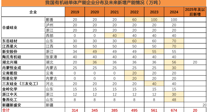 据百川盈孚,20192024我国有机硅中间体产能从151.5万吨加速增长至344.0万吨,年均复合增速为17.8%。2019年我国有机硅单体产能合计约314万吨,到2024年增长至674万吨(折合成DMC在340万吨),CAGR为16.5%。截至2024年,我国有机硅单体生产企业合计13家,其中合盛硅业、东岳硅材、江西星火为产能最大的主要有机硅单体生产企业,合计占总产能的47%。