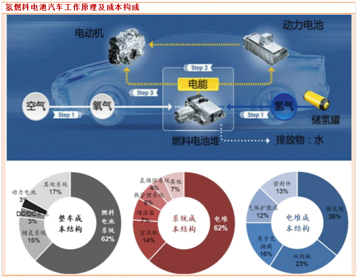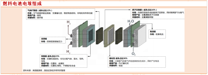 燃料电池电堆可谓氢能源车的心脏,燃料电池电堆主要由催化剂、质子交换膜、气体扩散层、双极板,以及其他结构件如密封件、端板和集流板等组成。燃料电池电堆成本占据燃料电池系统成本60%以上,因此降低电堆成本是燃料电池汽车商业化的关键。膜电极与其两侧的双极板则组成燃料电池的基本单元。