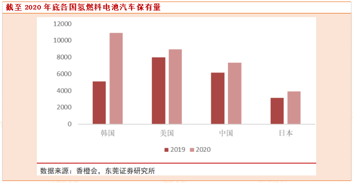 作为能源技术革命的重要方向,氢燃料电池汽车得到了日本、韩国、欧洲、美国、中国等国家的高度重视。截止2020年底,我国氢燃料电池汽车保有量为7352辆,进入商业化初期。