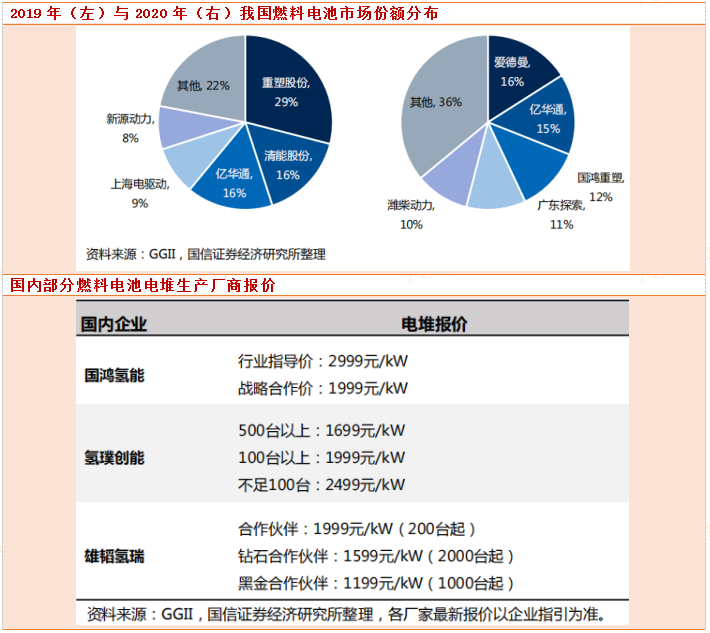 国鸿氢能、氢璞创能、雄韬股份(旗下雄韬氢瑞)纷纷公布电堆大批量价格。得益于核心材料和关键部件的国产化进程加速,2020年我国燃料电池系统和电堆的价格已经实现30%-50%幅度的下调。未来几年,随着国产核心零部件的规模化以及竞争加剧,未来几年电堆售价有望按照每年25%-30%的速度下降。