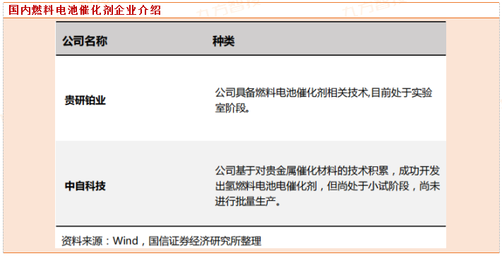 日本田中贵金属、英国庄信万丰和比利时优美科是全球最大的几家燃料电池催化剂供应商,催化剂制备技术处于绝对领先地位,已经能够实现批量化生产(大于10kg/批次),而且性能稳定,可靠性高。国内催化剂厂商包括贵研铂业、中自科技、武汉喜马拉雅以及上海济平新能源等也从事相关产品研发。